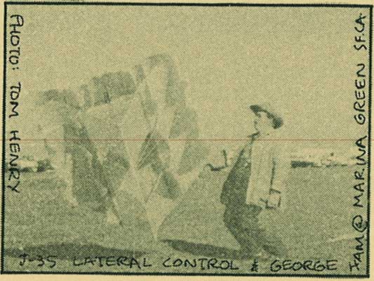 Many new kite creations and vari¬ations have hit with the great flying weather. Sam Urner has been holding the line on several beautiful Hamamatsu kites. Lee Toy has been drawing crowds with his 34 unit tissue paper delta train, as per Jack Van Gilder inspiration;and a Nishibayashi variation in cloth, George Ham has sewn up two new parafoils, an exquisite 4-patch J-30 and an unique J-3 with ten cells and three rows of flares across. Roland and Jeffrey Paris colabor¬ated on a beautiful four foot Conyne and a Spinnaker cloth variation of the commercially made Firebird, Tom Henry’s claim to fame are two parafoils and a delta. He flys a J-70 that looks like the test pat-tern en a color TV and a light wind variation of the standard J-7.5. The lkfoot delta is unusual in that it is spared with 1/2″ hollow fiberglass and a handmade hollow carbon fiber cross-spar. Mix MacGraw walks the Green with the world’s flashiest kite bag.