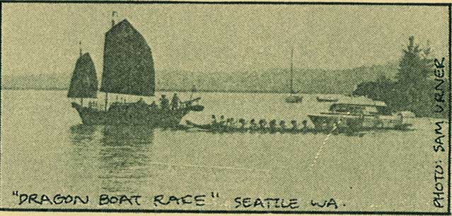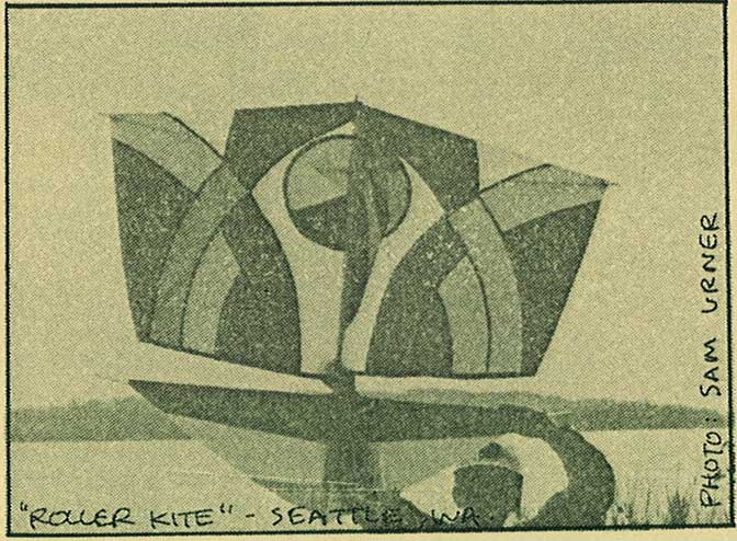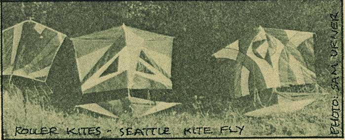 Margaret Greger sent down some beautiful slides of the kites constructed by the Shirone Kite Team at the Bon Marche Dept. Store for the “Orient Express” event held in Seattle last September. Tsutomu Hiroi, famous Japanese kite= flier, is the leader of the team. Although the winds were not strong enough to lift the kite during the actual kite event, they did come up and created a kite sight seen for the first time in the United States. Sam and Nancy Urner were present for the festival and had a great time.