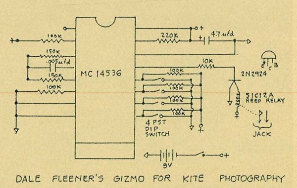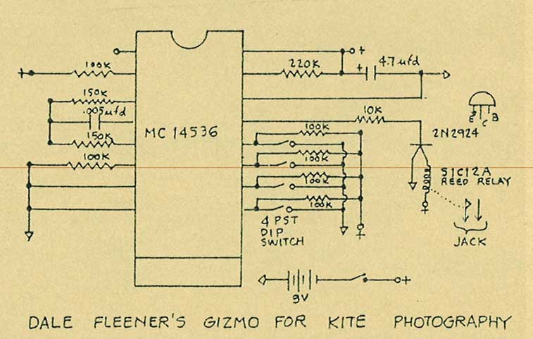 In case anybody there is interested in photography by kite, here’s a circuit for an intervolometer I use. I haven’t had the wind to try it after building it, but it works great on the ground. The DIP switch varies the time between con-tact closures according to the various combinations of “OFF’s” and “ON’s”. (SEE iLt.u.STRATiON-17.3)