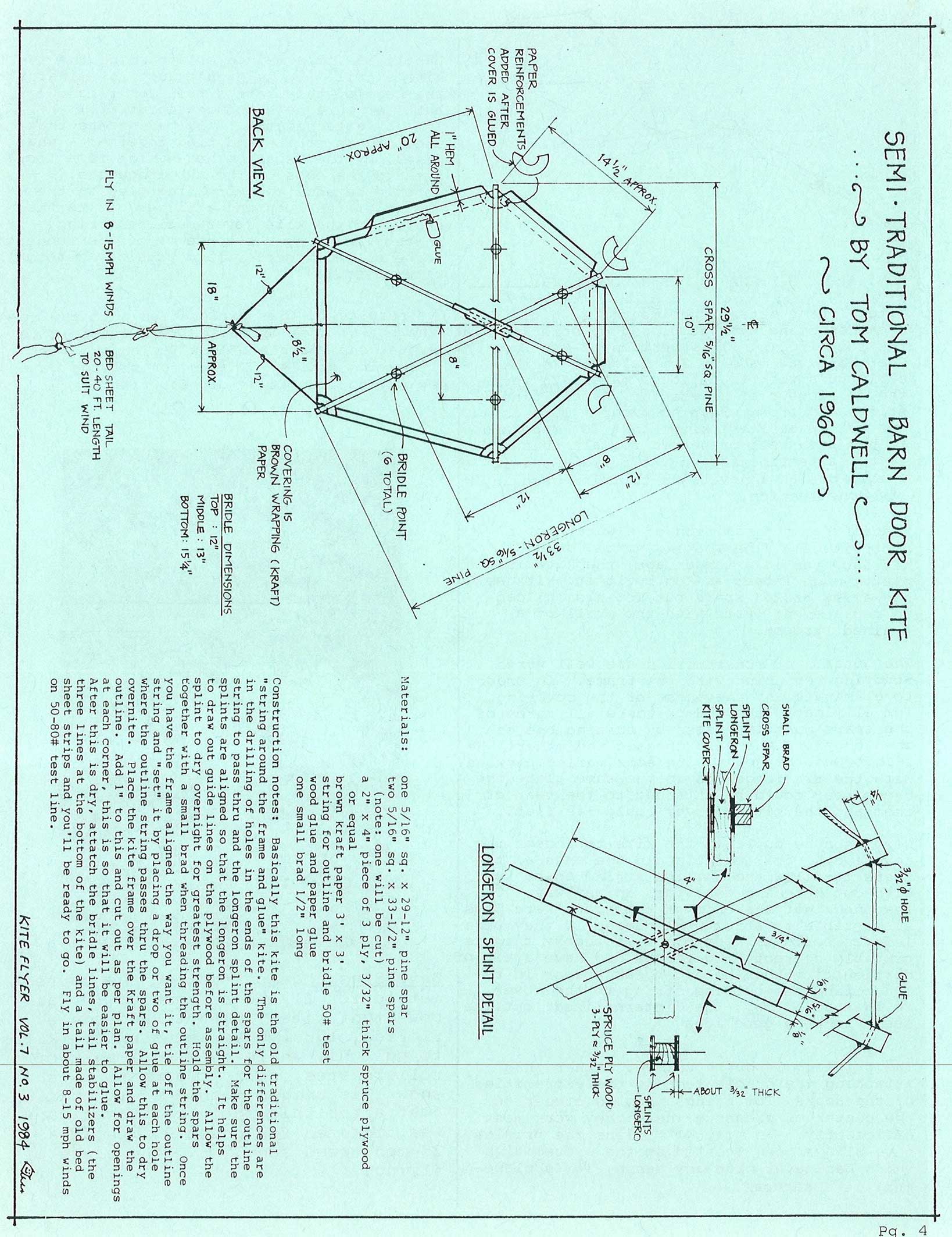 Kite Flyer’s kite of the month is an old American stand by that popped up sometime in the late 1800’s. This version of the Barn Door Kite was made by Tom Caldwell in the early 60’s when traditional materials were the de rigueur of kitemaking, namely pine sticks and brown wrapping paper. This is one of the earliest kites that Tom made and it has been well preserved for all these years, a testimonial to its builder and its unique design innovations that Tom used in its construction.