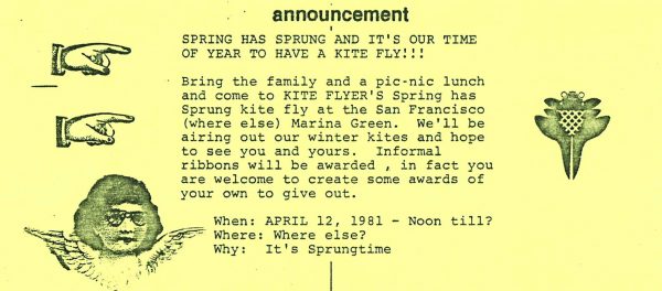 By way of standard reference–KITE FLYER NEWS is available six times a year (weather permitting) at the minimal cost of a trip to Doggie Diner–$5.00 a shot. Send all money, trading stamps or gold bars to 861 Clara Drive, Palo Alto, CA 94303.
