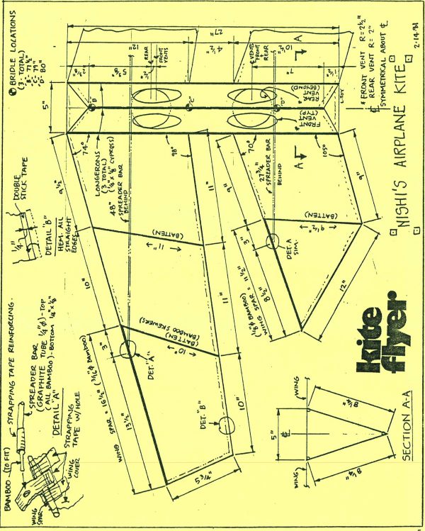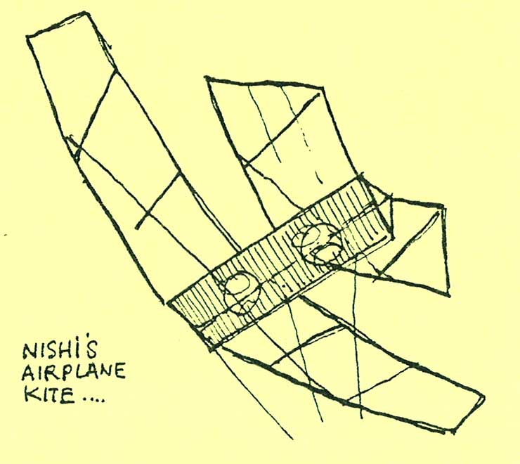 Nishibayashi, of Tokyo, Japan, seems to be spending more time stateside than in his native country. His last visit was during the AKA convention held in Seattle last October. At the kite fly there one of his airplane style kites placed 3rd for the most beautiful contest. This month’s kite design is a similar design to the winning kite. Although the kite is somewhat more complicated than some of his previous kites it is still basically a simple and straight-forward design. Typically his materials include bamboo, spruce and fiberglass/graphite spars with high-density polyethelyne for a cover material. The component parts are put together with double stick tape and strapping tape. The cover is colored with colored markers.