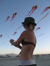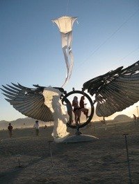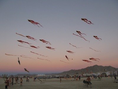 But could it be that we’ve overlooked another forum where kites directly influence their audience? That heretofore overlooked forum? Burning Man, the alternative arts festival held annually in the Black Rock Desert of Nevada (Burning Man is that largest arts-granting organization in California, to give you some idea of how it’s grown). Here, over the last fifteen years (approximately, and coincidentally about the same age as the Foundation), the Department of Tethered Aviation has been a constant reminder to the participants, that kites and kite flying might hold a special place in their lives. To date, two Drachen Foundation Board Memebers have participated at Burning Man and many friends of the Foundation have commented for years that the "scene" there is ripe for the many positives of kites. I can remember feeling that Corey Jensen had somehow performed kite sacrilege when he – years ago – chose Burning Man instead of the Washington State International Kite Festival (Long Beach). But I must admit, here was a new forum for kites, one at which the average participant had no knowledge or interest in kites (a far cry from the participants and audience at Long Beach).