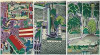In my recent organizing I have found two prints (three panels each) that were very interesting and that illustrate a type of ukiyo-e that I was previously unfamiliar with. One is a straightforward view of a kabuki play, but the other is a little like the sugoroku; it’s a view of the same moment in time, but meant to be cut apart and made into a diorama.