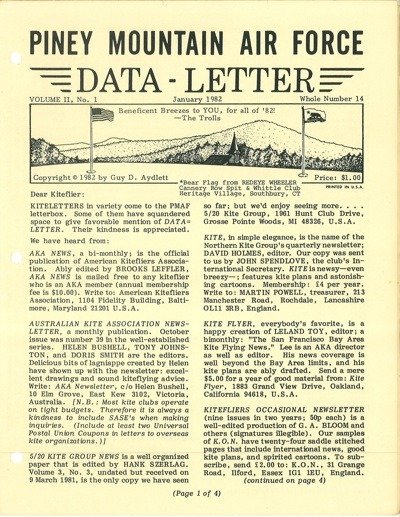 What is the Data-Letter and why is it worth celebrating, you ask? For some, the title of this newsletter would indicate its content to be something related to a veteran’s group of the United States Air Force. For those who are familiar with the Data-Letter, there is very little militaristic about it. Well, other than the fact that it was published monthly without fail for four years straight (December 1980 through December 1984) and that it still has "veteran" readers in the kite community – people who remember the glory days. You may now consider yourself a part of this exclusive club. This sort of banter is, of course, in the spirit of Guy D. Aydlett, who wrote from his "editorial dungeon" in Charlottesville, Virginia. His wit, eclectic humor, illustrations and scientific interest to kiting are deeply infused into every page of the newsletter, and it is clear he carried along a community of like-minded local Virginians and readers across the country. Sounds like a good four years of kiting history, doesn’t it? Read for yourself, tell us what you think, and let the Data-Letter live on!