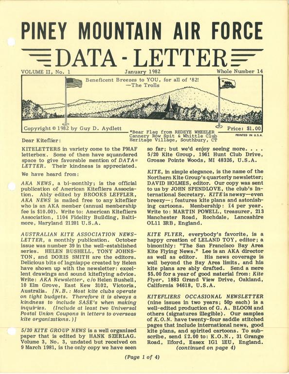 What is the Data-Letter and why is it worth celebrating, you ask? For some, the title of this newsletter would indicate its content to be something related to a veteran’s group of the United States Air Force. For those who are familiar with the Data-Letter, there is very little militaristic about it. Well, other than the fact that it was published monthly without fail for four years straight (December 1980 through December 1984) and that it still has "veteran" readers in the kite community – people who remember the glory days. You may now consider yourself a part of this exclusive club. This sort of banter is, of course, in the spirit of Guy D. Aydlett, who wrote from his "editorial dungeon" in Charlottesville, Virginia. His wit, eclectic humor, illustrations and scientific interest to kiting are deeply infused into every page of the newsletter, and it is clear he carried along a community of like-minded local Virginians and readers across the country. Sounds like a good four years of kiting history, doesn’t it? Read for yourself, tell us what you think, and let the Data-Letter live on!