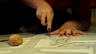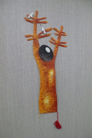 Art kite by Alessia Marrocu (Italy). Depicts two birds in a tree. Woodblock print on washi with bamboo spars. Commissioned by Drachen Foundation for Wings Over a Floating World exhibition to travel through Mexico in 2010.