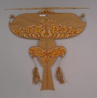 Traditional paper kite from Cambodia. Made with brown craft paper and bamboo. Two-point bridle, the hummer is hand carved of wood. This is a smaller version of a Khleng Ek, hand painted with traditional designs in watercolor paints.