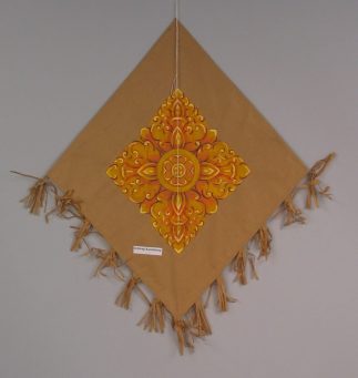 Traditional paper Khleng Kandaung ("without a tail" kite) from Cambodia. Made with brown craft paper and bamboo. This is commonly flown by children, as a single line kite or a fighter. It can be made of in expensive lightweight white "bond" or brown craft paper. This one is particularly pretty, wiith an ornate traditional design in waterbased colors. The fringe is applied to both sides of the bottom of the kite, giving it a tail-like flying property as well as a nice design.