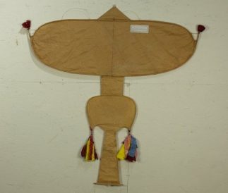 Traditional paper kite from Cambodia. Kite sail is made with recycled paper and bamboo spars, torn pieces of printed cotton fabric are used for two small tails at the bottom and tassels at top, monofilament is used for connecting the spars. No bridle or "Ek," musical attachment. Kite sail front is labeled with kite type and kitemaker's information.