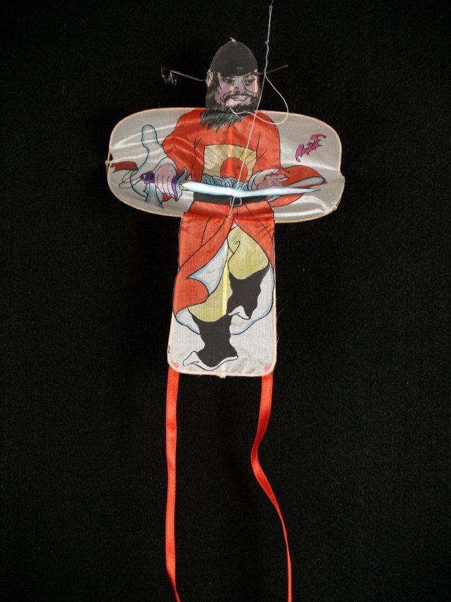 Chinese kite. SIngle line. Painted silk, bamboo, ribbon. Image depicts warrior. Red, yellow, black, purple, blue, pink. (China)