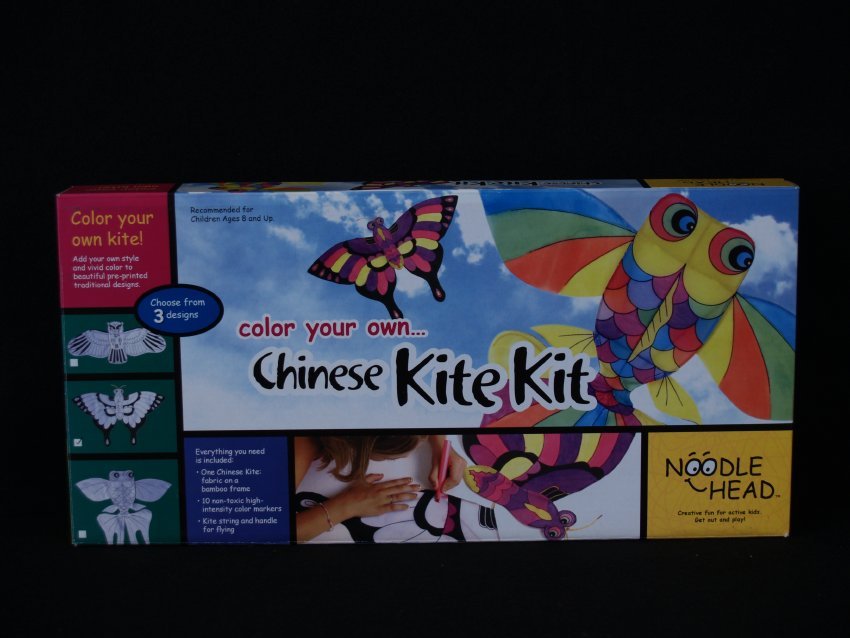 "Color Your Own Chinese Kite Kit" kitepainitng and making kite by Noodle Head. Includes one fabric butterfly kite with a bamboo frame, ten colors of waterbased markers, flying line on a plastic winder, and instructions. Enclosed in a box.