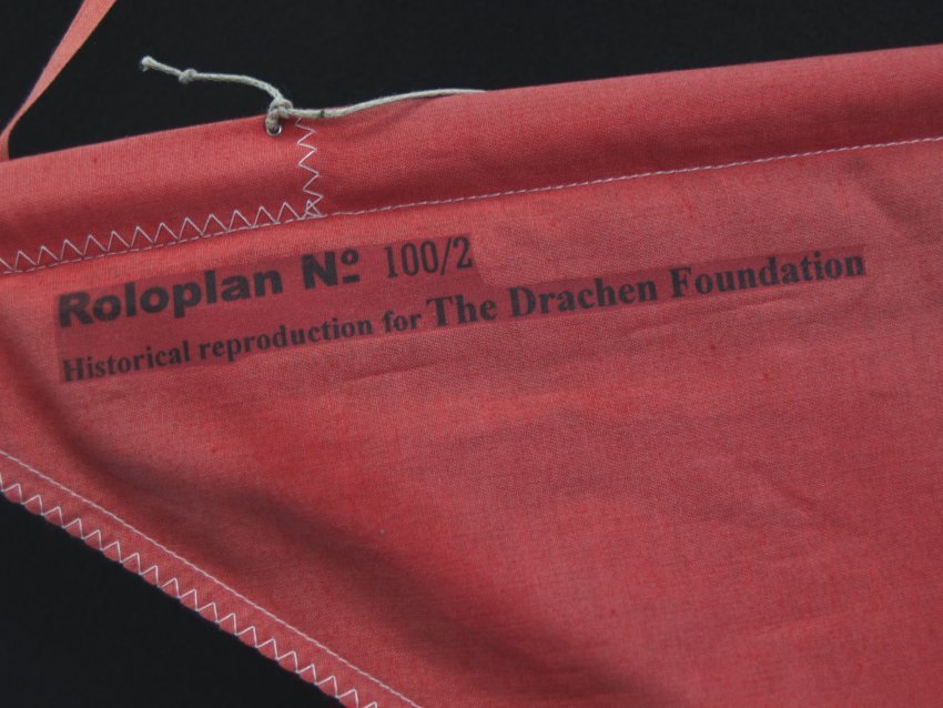 Contemporary historical reproduction of a 1909 Roloplan kite, 100/2 manufactured by H and W by commission from DF.Sewn red and blue cotton, includes a red cotton drawstring bag and wood spars.
