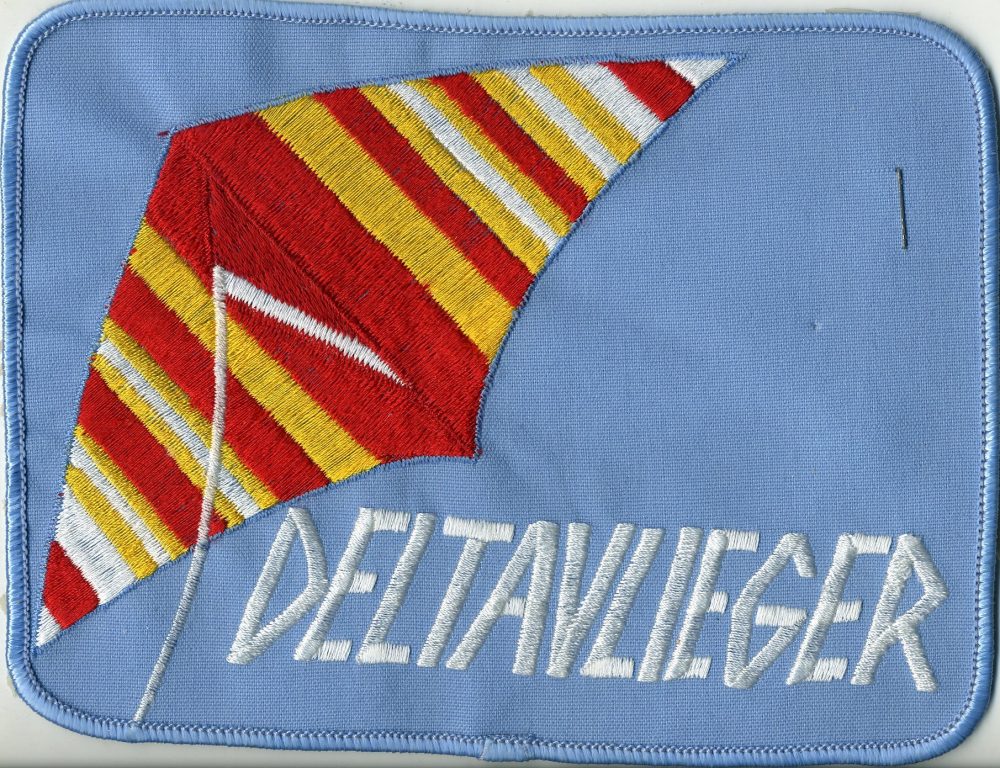 Large "Deltavlieger" patch with deisgn of a red, white and yellow delta kite against a blue sky.