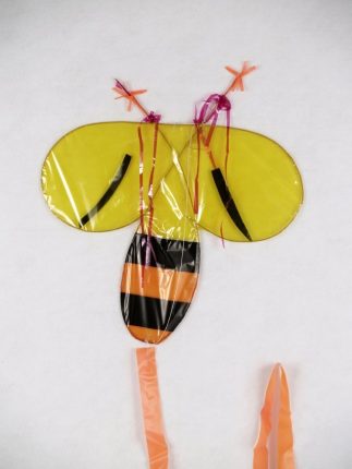 Bee Kite. Single line. Plastic/Mylar/Bamboo. Pieced Mylar of Yellow, black, orange, pink. 1993. Kite Maker: Elmer Wharton, Chicago, Illinois.