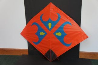 Grandmaster Fighter kite, red body, 3 blue fighter shaped designs with yellow tear drop shapes in the middle. Clear red plastic tail.