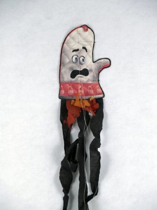 Art Kite. Single line. Arbys Hot Pad design. Printed Paper/Bamboo/Crepe Paper tail. Commercially printed Red/orange/yellow/black/blue/gray. 2003. Kite Maker: Greg Kono (Seattle, WA, USA)