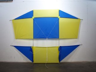 This lifting kite was designed for high performance KAP (kite aerial photography) of ripstop and carbon fiber. Four-point bridle. Constructed in two sections, made 9/9/2003.