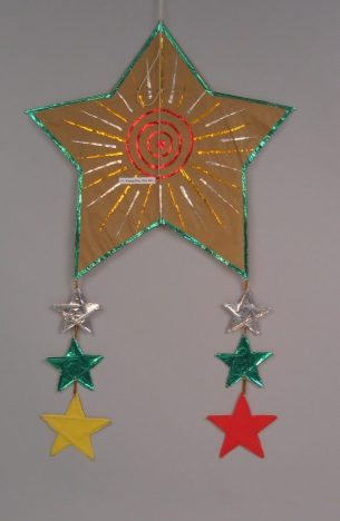 Traditional paper Khleng Pkay (Star Kite) from Cambodia. Made with brown craft paper, metallic glued paper and bamboo. This is a decorative kite favored among kite flyers. There are many differernt versions and shapes of this type of flat kite that differ from province to province. Two-point bridle.