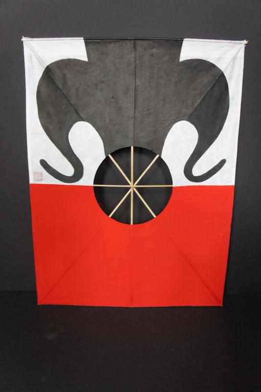 Red & white kite with bullhorn design on the white section