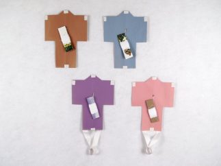 Paper Sode examples. Set of 4. Single line. Construction Paper/Bamboo/Paper/Tape. Brown, Blue, Purple, Pink. 8/27/01. Kite Maker: Mary Yoshimi, Washingotn