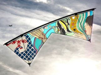 This kite was donated to the AKA auction by Revolution and was created by 6 different artists. Each artist starting with Randy Tom did one section of the kite and then sent the kite to the next artist (starting on the right side as you look at it in the picture). Each artist didn't know what the others were going to do or have done. This is the only Revolution that was produced this way.
