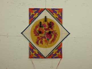 Commercial Nantong Whistle kite from Nantong, China. Not a good flyer, but used mostly as wall decoration. Made painting nylon/synthetic material stretched over a bamboo frame. Usually the whistles are gourds, but these are cut bamboo, lacquered. Five-point bridle.