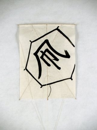 Old Kaku kit kite with Rokkaku design on front. Single line. Paper/Bamboo. Black paint on white paper. Made 2/2003 at Fort Worden Kite Conference.
