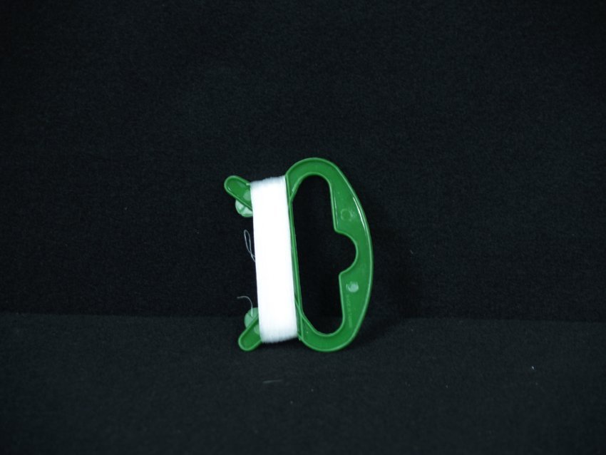 Green plastic winder with nylon monofilament line. Made for toy kite market, common product of Asia.The Drachen Foundation orders over 100,000 of these each year for use by school teachers.