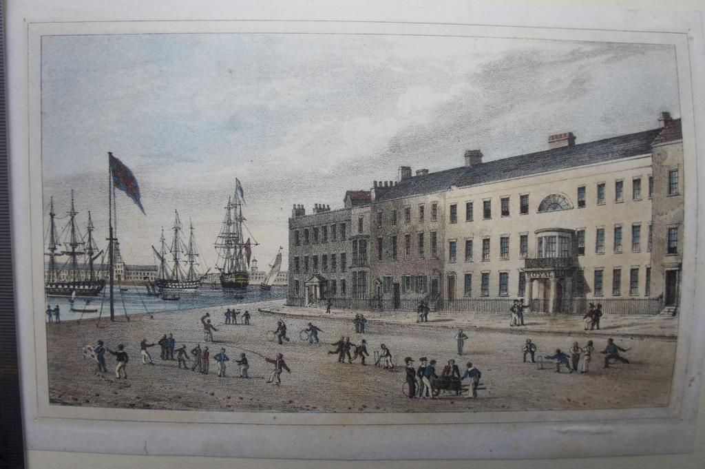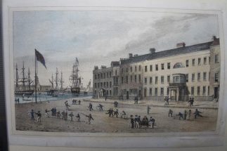 Untitled book print showing the waterfront, probably London, in the early 1800s. Flag is a Union Jack, Warehouse has the word "Royal" over the door. In the foreground of the print, children play games of the day; jump-rope, stick and hoop-rolling, kite prepared for flight, and maybe, cricket (two wickets set up, a batsman at one).