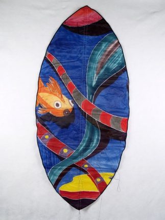 Art kite. Single line. Fabric dyes on ripstop and fiberglass spars. Painted Blue, Red, Yellow, Orange, Black, Turquoise, Gray. 2001. Kite Maker: Randy Shannon, Arizona