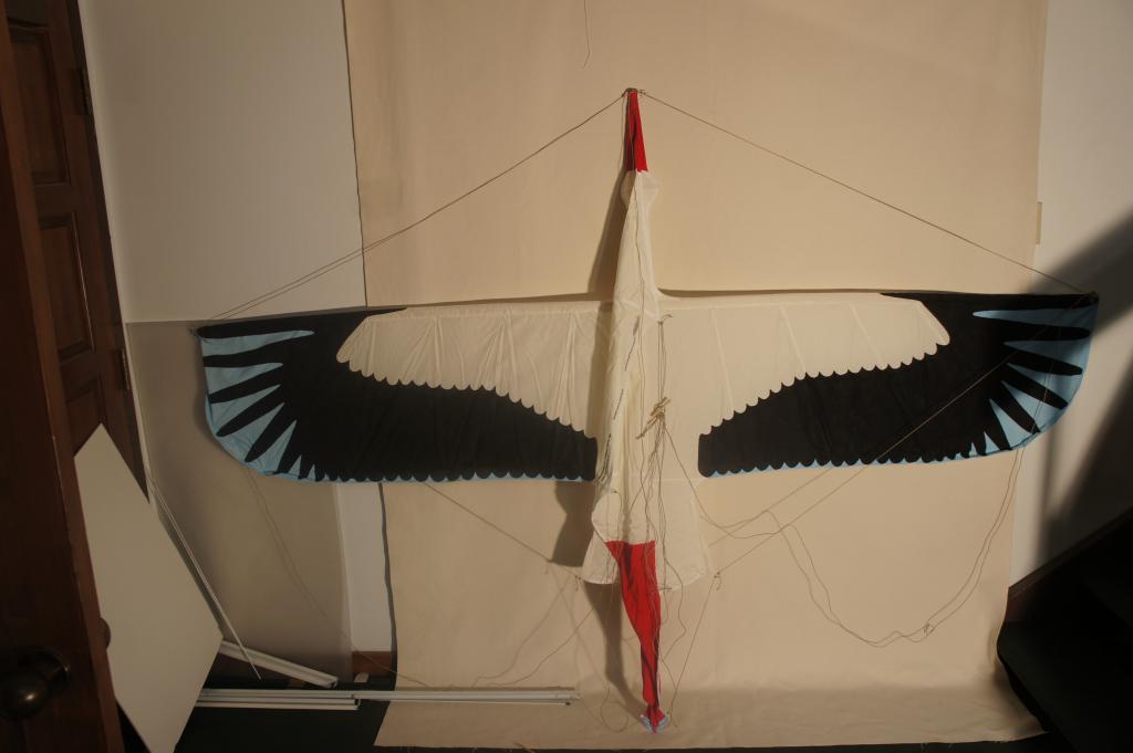 Richard Steiff Drachen No.16 by Wolfram Wannrich is a Crane kite, white body with black feathers, orange beak, and orange "feet".