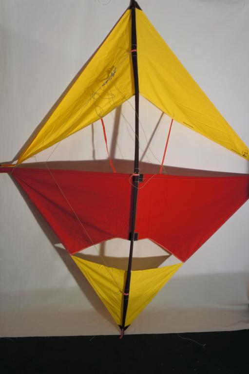 Richard Steiff Drachen No. 6 replicated by Werner Ahlgrim, a 3 panel kite, yellow & red with 2 connecting strips at the upper portion.