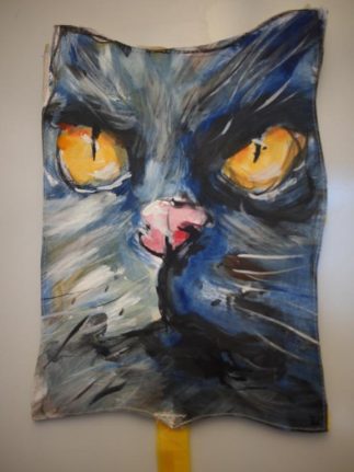 Purchasing string winders from Drachen for his educational workshops, he sent us payment by making this cat kite envelope, of board stock hand painted with an image of a cat, and the backside spared with tree branches. The tail is of thin strips of plastic, 21 inches long. Although too heavy to fly, it is quite the kite sculpture. The check for payment was sewn inside the kite. It was posted through Canadian mail and arrived safely at our office in the United States.