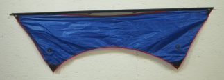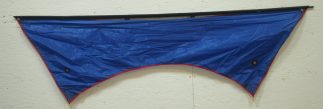 Small version of the Revolution Kite, not made by Revolution Kites. Made from blue ripstop, topped with black mesh fabric, one horizontal spar, no verticals, no bridling. Kite is unfinished.