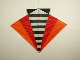 Fighter kite by Stan Swason (USA). Made from orange, red, black and white ripstop with fiberglass and dowel spars. Two spars are removable. This is an artful fighter kite, easy to fly, as it's size makes it move slower, perfect for learning. It was a design from Seattle cottage industry kite maker Stan Swanson. Two-point bridle.