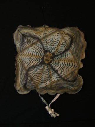 Square with wavy edge art kite by Francisco Toledo (Oaxaca, Mexico). Handmade paper from Etla, Oaxaca used for the sail with split reed spars. Airbrushed stencil design is an animal face against a background of orange, yellow, black and brown wavy lines that spiral around the kite.