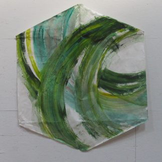 Contemporary rokkaku kites made of hard tyvek and dowels by Phantom Kites (USA). One in a series of four, blue, red, orange and green. Painted with acrylics by Ali Fujino (USA) and Greg Kono (USA) for the 10,000 kites event of LA.