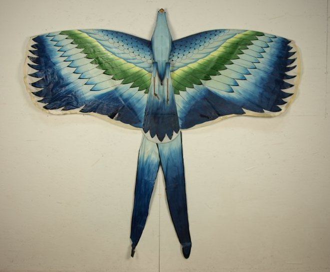 Three dimensional bird kite made by Nguyen Van Cu (Vietnam) of the Flying Kite Club, Hue City. Made with a painted synthetic fabric sail, with detailed beak and eyes. Wings are attached and connected with bamboo hooks, tail is separate, attached by seating in vinyl tubing. Staples are used to attach tail pieces and the sail body is glued to the bamboo spars. Legs are made with lacquered and painted fabric, and feet are bamboo. Included are a two page direction sheet and a plywood winder with nylon flying line. Two-point bridle.