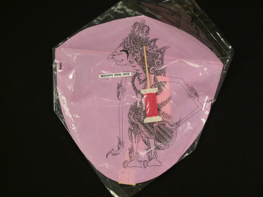Wayang Oval Kite from Indonesia. Pink tissue paper kite on a bamboo frame with a printed image of an ornately decorated man, possibly a mythical figure. Two tails are yellow and blue crepe paper. Enclosed in plastic and includes pink kite line on a winder.