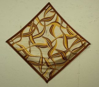 Diamond art kite by Stormy Weathers (USA). This is one of a series of scarf kites done by Stormy Weathers. Each one is different, testing out various bridling and tail configurations. He used monofilment for this tail, one-point bridle, bowed. He used dowels for spars.