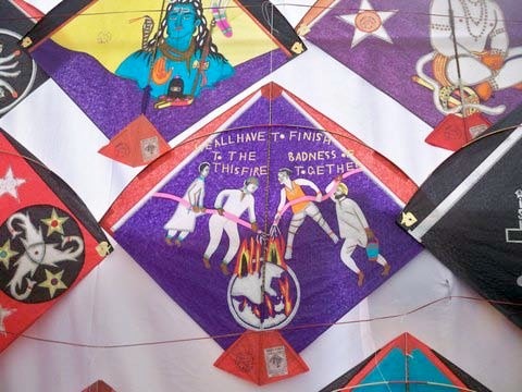 ABOVE: Indian kite maker Babu Khan at Chaugan Stadium. BELOW: A kite from the Babu Khan Collection. Khan kites are constructed of intricate tissue paper applique.