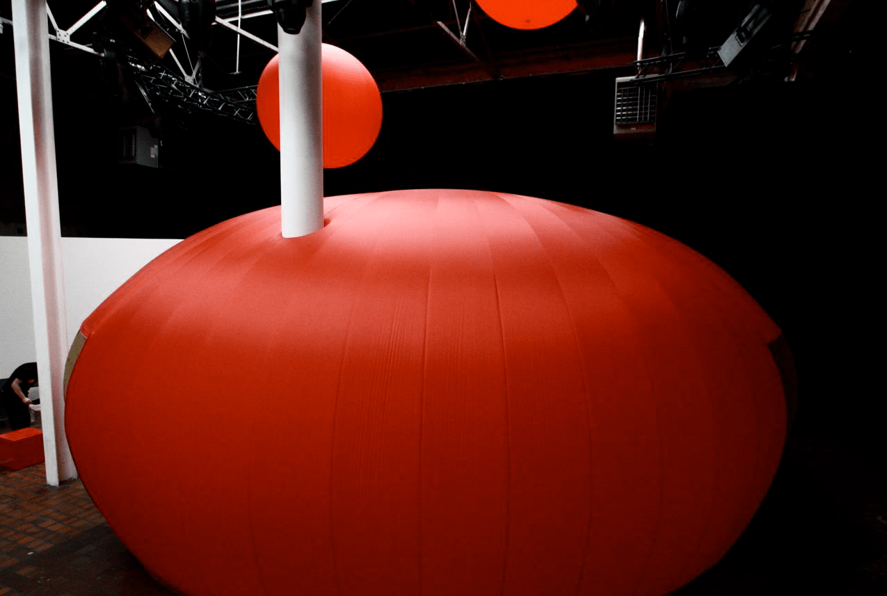 Kite Related Design. Robertshaw was commissioned to develop this installment for the UK launch of the Nissan Cube. The concept was to reflect a meniscus or molecular curve, a droplet of water on a horizontal surface. The inflatable single-skin sphere is shown at London’s Brick Lane Truman Brewery Gallery.