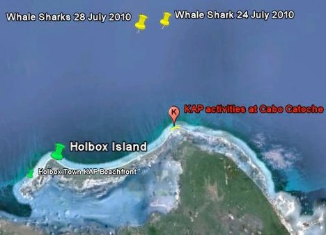 We used the methodology developed in previous years to do the KAP activities from a 27 foot outboard motor boat. We surveyed the northeastern side of the island and the whale shark observation area of the Yum- Balam Reserve north of Cabo Catoche.
