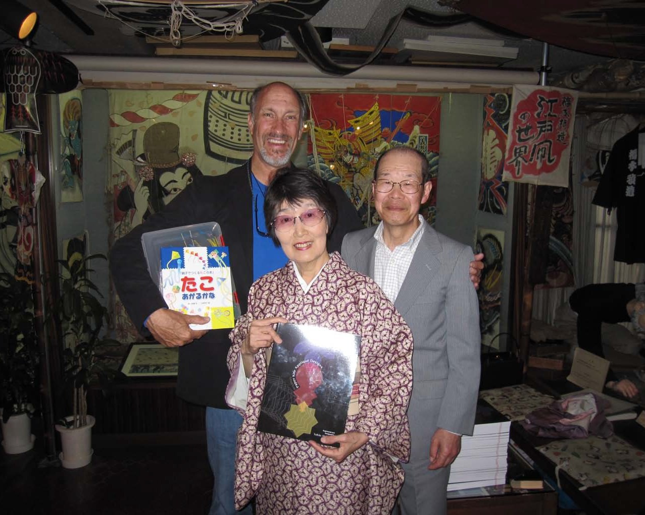 Drachen Foundation. Scott Skinner with Japanese kitemaker Yukio Akiyama and his wife, holding Akiyama’s Paper Kite Appliqué Designs book, published by Drachen. “I can’t think of a better ambassador for the world of kites.” – Joe Hadzicki