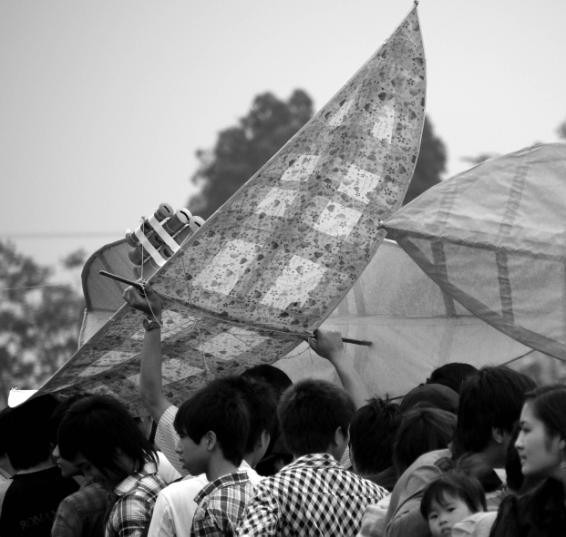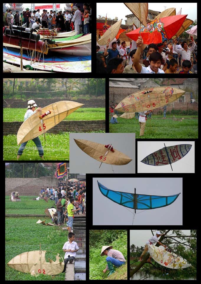 of the children found a dead bamboo whose stem had broken to leave the hollow reed exposed and which made a sound when the wind blew across it. The children cut down the bamboo to try to discover the secret of the sound and, as a result, they created a wind-blown flute. They attached the flute to the kite and this became the origin of the Vietnamese flute kite. The kites would fly high into the sky with the flutes sounding. When the villagers heard the sound, everyone became interested and from that time the kite was no longer considered just a children’s game. The whole village made flute kites and flew them together. The flute sound made everyone feel happy; they forgot the weariness of their work and carried on working more enthusiastically.