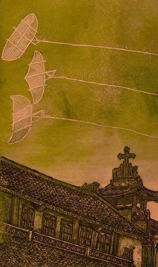 However a sudden catastrophe came down and engulfed them. The world fell into darkness and heaven and earth were divided. The heavens rose higher and higher and became separated from the earth. The heavenly gods and the earth-bound humans were no longer able to meet one another and this created a deep feeling of sadness. This led to the creation of the kite which became the string to link together the affection between heaven and earth. The melodious sound of the kite flute showed the love felt by the people in lower world to those above.”