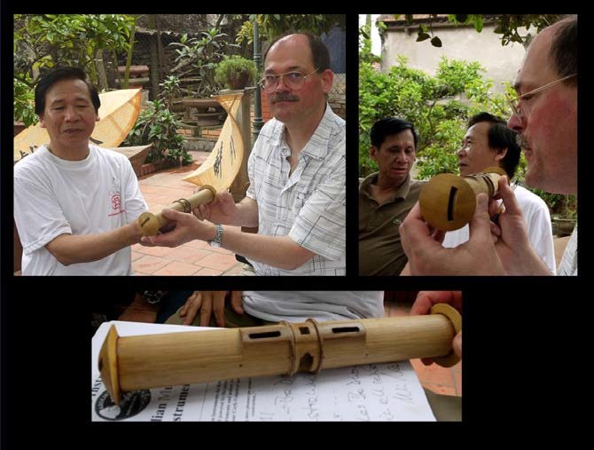 1 It is as well to explain our definition of the flute at this early stage. To many, the flute is the assembly of Aeolian devices that we saw attached to a stick and suspended above the kite. In fact these assemblies may contain several individual flutes. And these individual flutes generally have two separate chambers, each with its own mouthpiece and tuned individually to provide a pleasing beat when flying in the air. We only saw one flute, the Friendship flute made by Mr Nguyễn Hữu Kiêm, that was more complex and which comprised two sets of flutes within one flute body. We hope that the reader will take this explanation into account when reading the descriptions.
