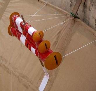 It was only after we had returned from Vietnam that contact was made with a group that fly the kites with very large single mouthed flutes. These are flown in Indonesia in the region of Kalimantan62. Individual flutes are made but they are mounted in pairs. In one case, see Figure 80, two pairs of flutes are mounted on one kite. The binding on the flutes gives a reference that enables them to be strapped to “rails” located at the leading edge of the kite wings. It is speculated that the single mouthed Vietnamese flute would have been mounted in a similar manner.