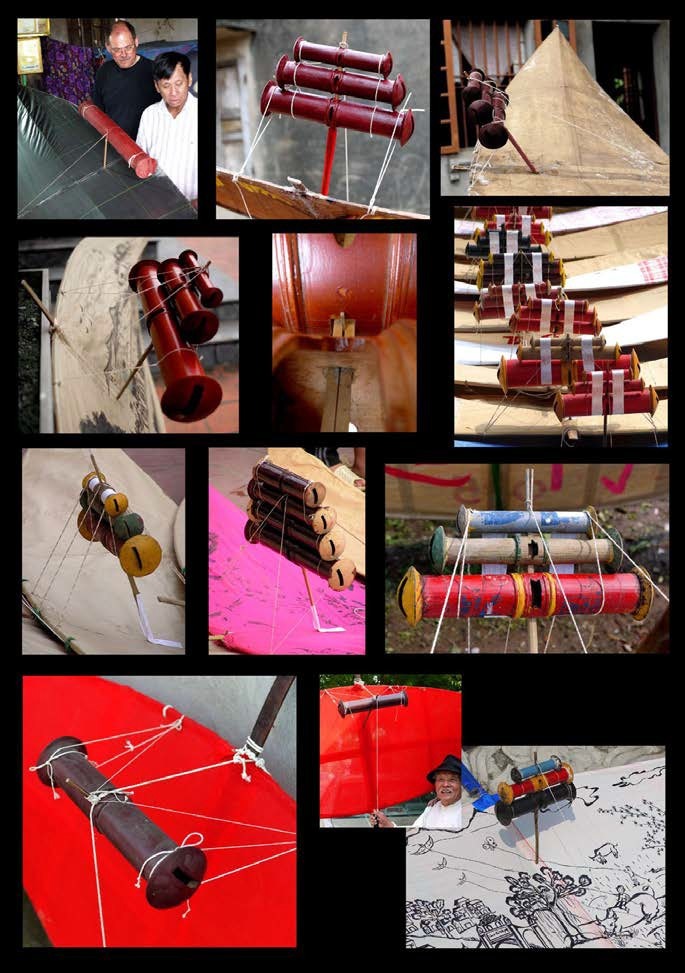 Figure 72 Flutes and flute kites from the Hải Phòng area. Note that 3, 5, 7 and 9 flute assemblies are made. Note also the high aspect ratio of the three flute assembly which indicates that this is a low wind flute. Credit www.HoangPhu.vn